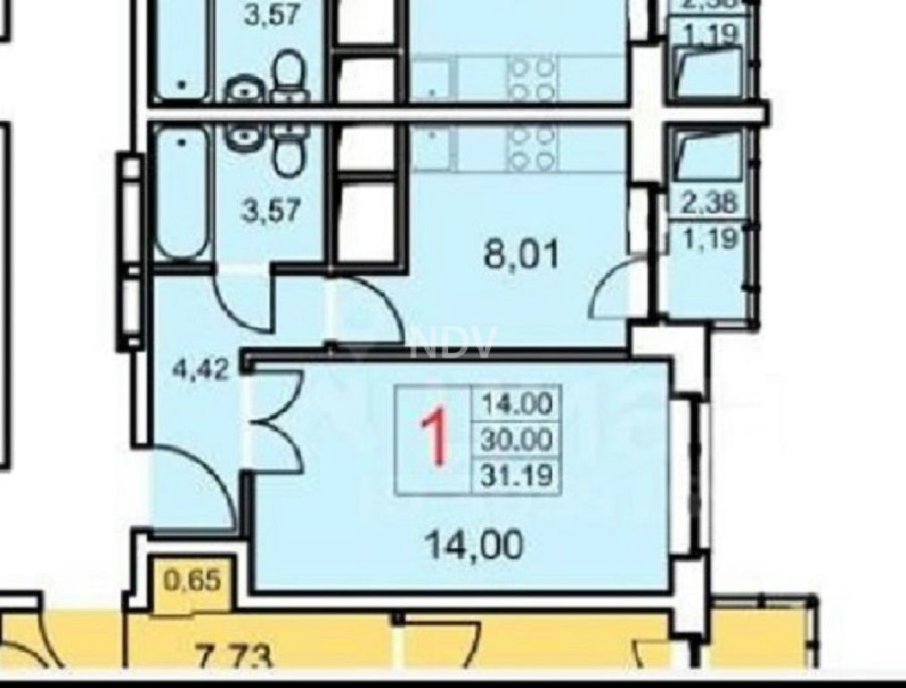 Квартира без отделки. Общая площадь без учета лоджии 30 м2, большая застекленная лоджия. Высота потолка 2,8 м